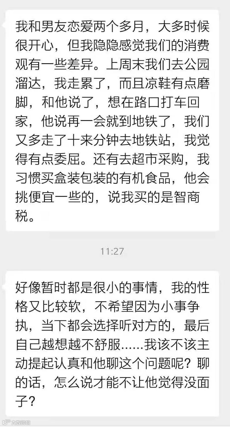 一位女生投稿说,恋爱两个多月,她隐隐感觉男友和自己的消费观有些不同,比如她走累了想打车而男友带她坐地铁、她习惯买有机食品而男友说那是智商税。她性格比较软不喜欢争执,当下都会选择听男友的,但之后自己会越想越不舒服。