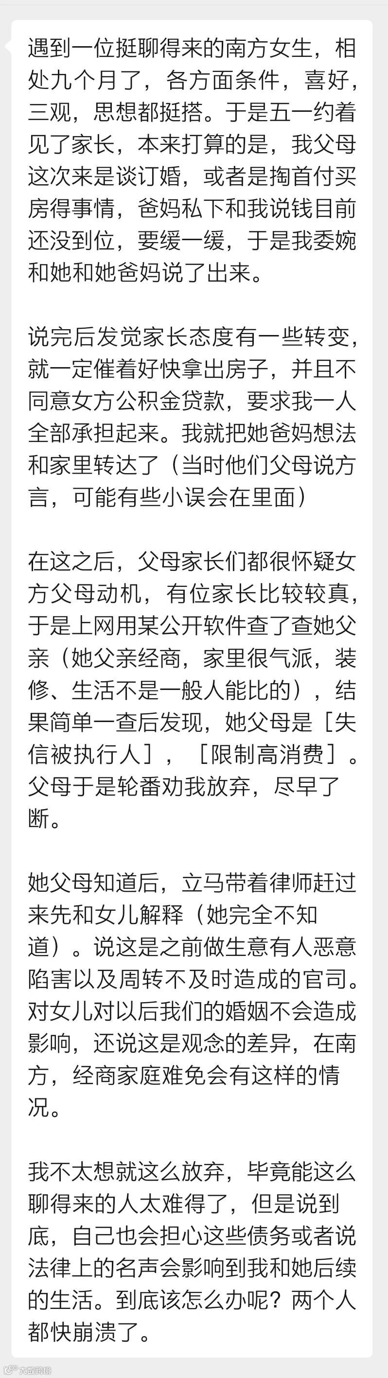 男生家里人开始怀疑女方父母动机,在网上查了女方父亲(其父经商,家里很气派),发现她父母是失信被执行人,被限制高消费。于是男方父母轮番劝他尽早放弃了断。
