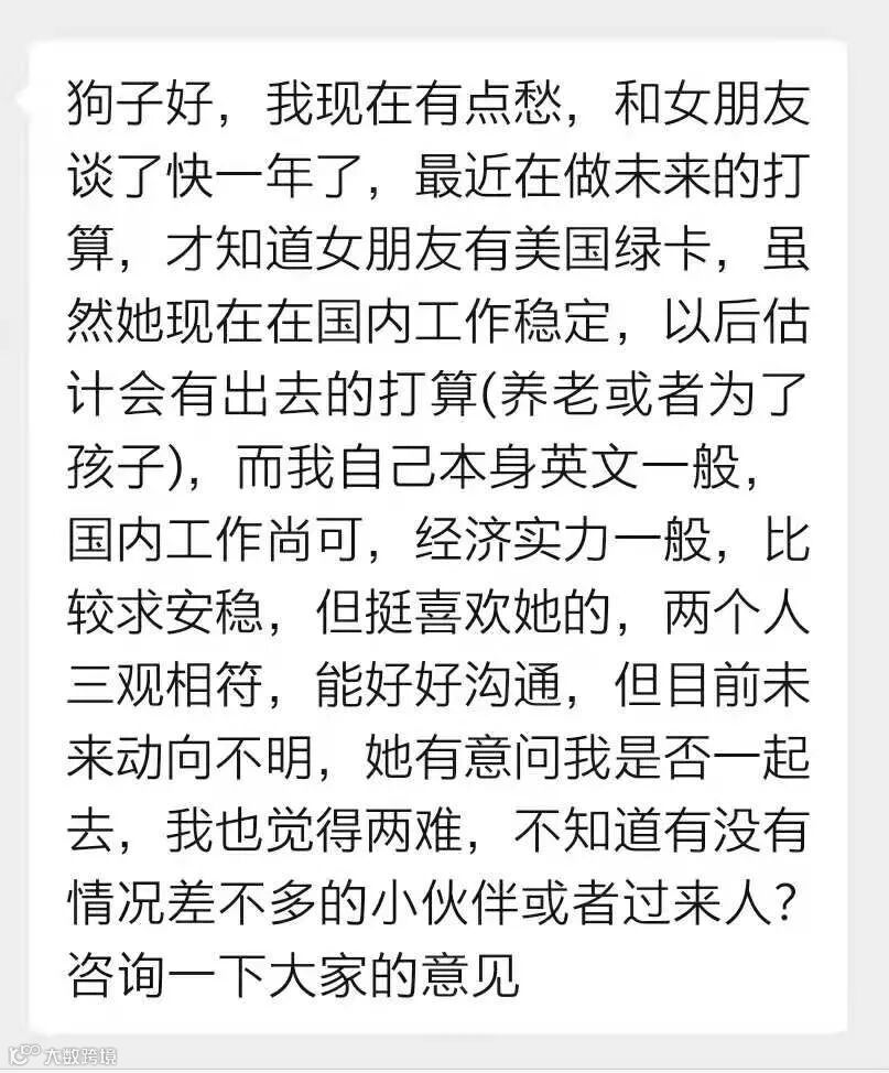 一位男生投稿说,他和女友恋爱将近一年,最近在聊未来的打算,他才知道女友有美国绿卡,她虽然现在国内工作稳定,但有未来为了孩子或养老出国定居的打算。