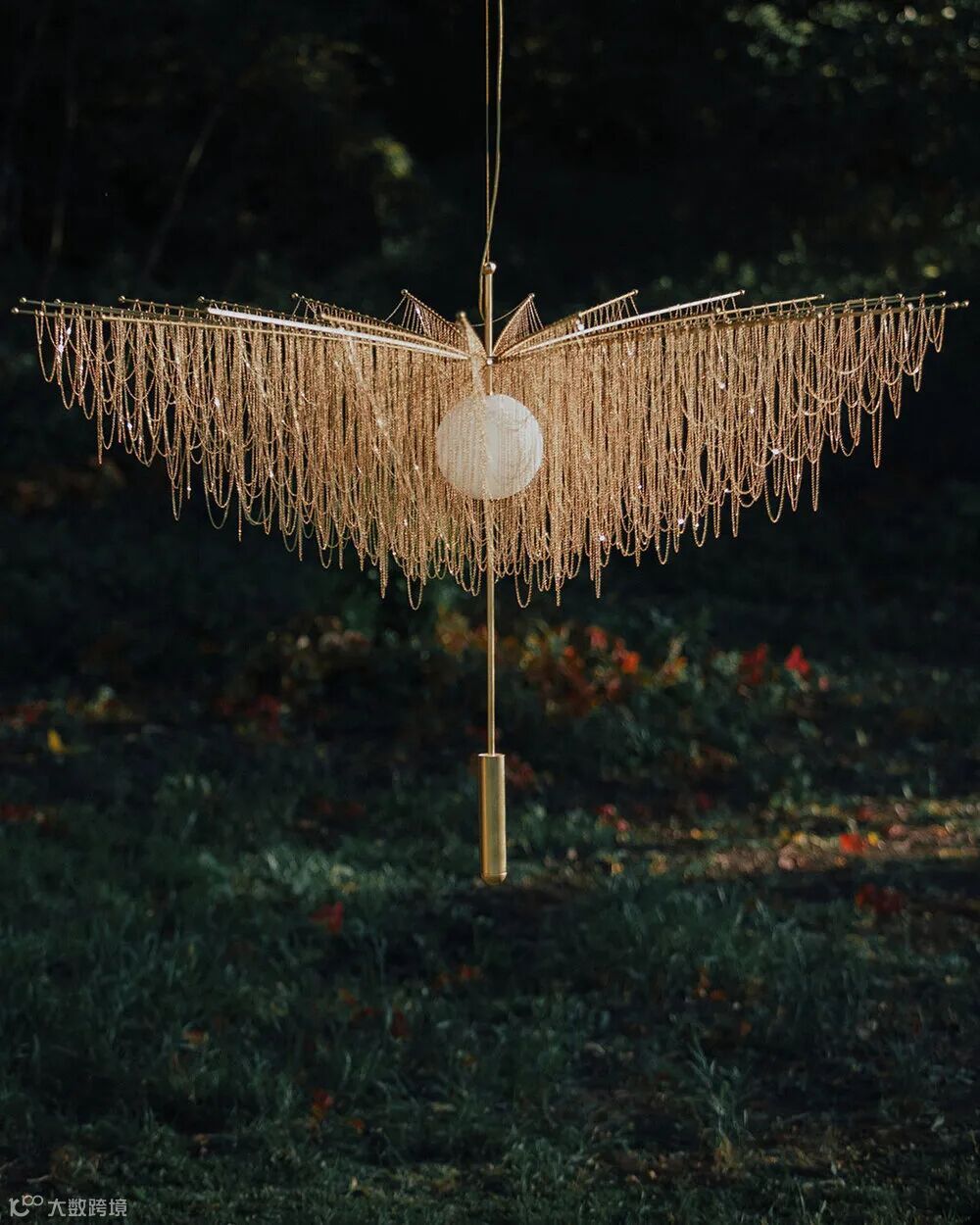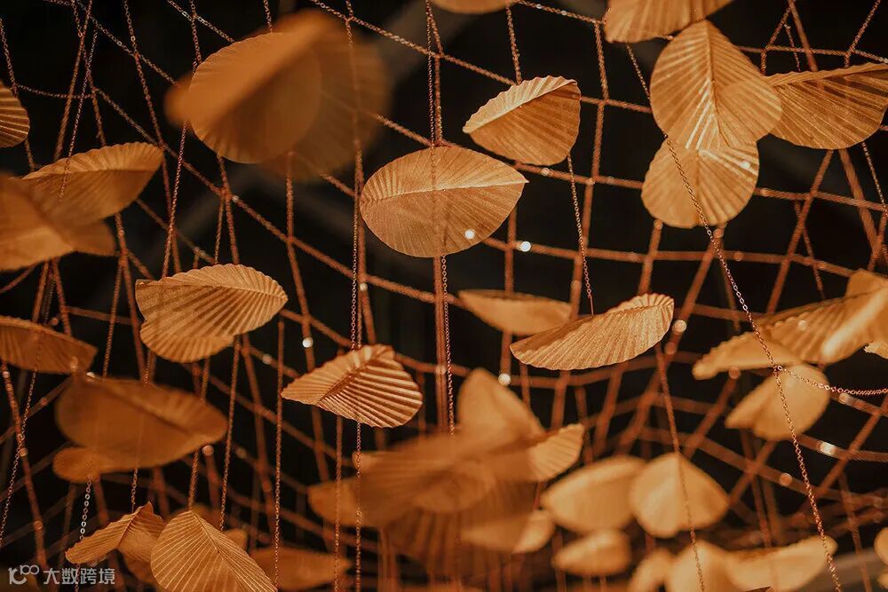 这件作品颇为灵动,一片片飞舞的“叶子”悬挂在手工编织的金链网中,散发出柔和而诗意的光芒。