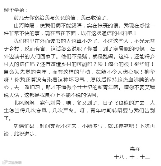 “嘉祥”为王稼祥的原名。1924年春,王稼祥到芜湖圣雅阁中学学习,开始接触《新青年》等进步书刊,逐步认识到要拯救国家和民族的危亡,只有进行民族民主革命,彻底改造中国。他参加了“协社”,创办了《狮声》月刊,主笔发表了一系列文章,在传播社会新思潮、唤起民众觉悟、推动芜湖学生运动等方面发挥了重要作用。11月,他给堂弟王柳华写下家书,希望一起“保持这热血沸腾的赤心,去一改旧习”,“做个廿世纪的新青年”。信末所署时间为“十八,十,十三”,是按日、月、年顺序写的,即民国十三年十月十八日。从信中提到的时令看十月十八日当为农历。据此,写信时间应是公历一九二四年十一月十四日。