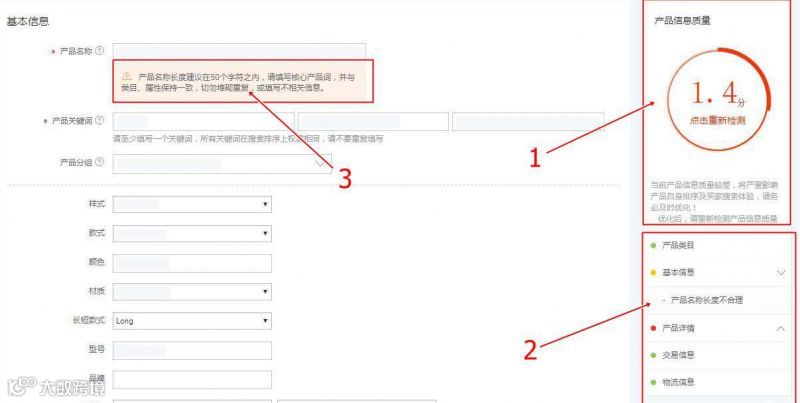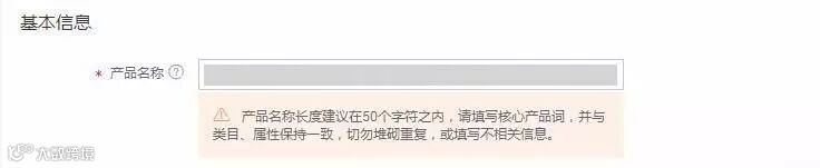 图片A中的3,在左边进行产品编辑的时候,如果系统检测到信息问题,那系统会实时提醒最优的建议,以产品名称优化提醒为例: