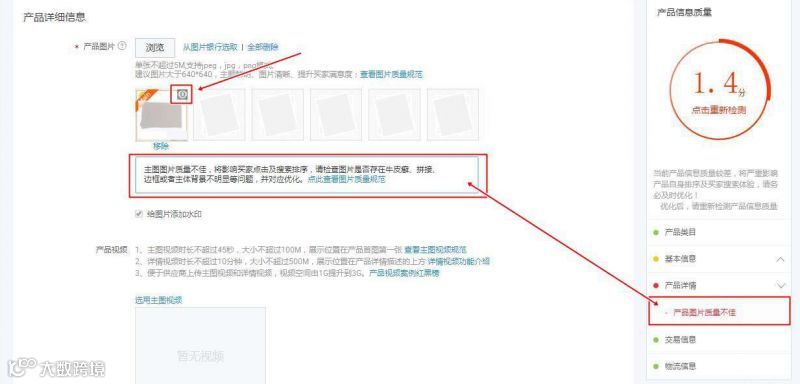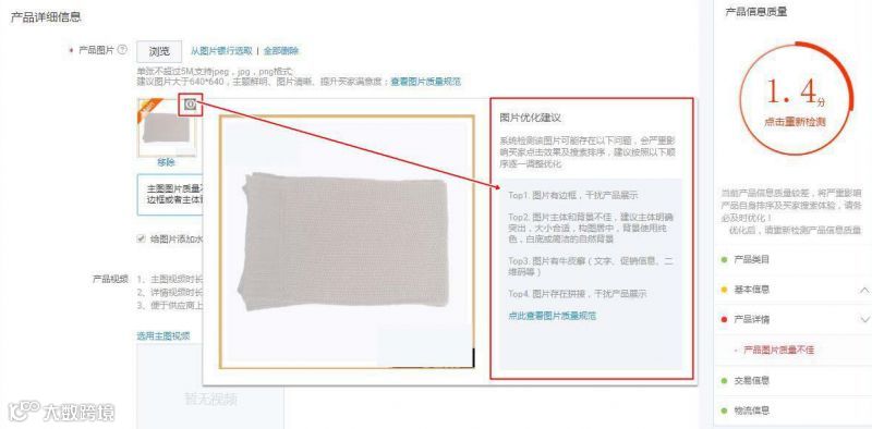 注意:这部分跟右边检测产品信息质量是同步对应的。我们以检测产品主图为例,进行检测后,右边提示“产品图片质量不佳”,左边产品详细信息在产品图片下边位置提示图片规则和优化建议,它们之间是互相对应的,非常及时。