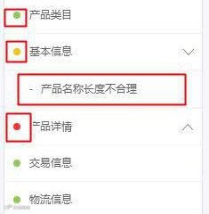 检测的维度包括基本信息,产品详情,交易信息,物流信息。系统会从这五个方面检测产品信息质量,并实时反馈质量问题。没有问题的前边圆点显示为绿色,有问题但不严重的显示为橙色,问题严重的显示为红色。