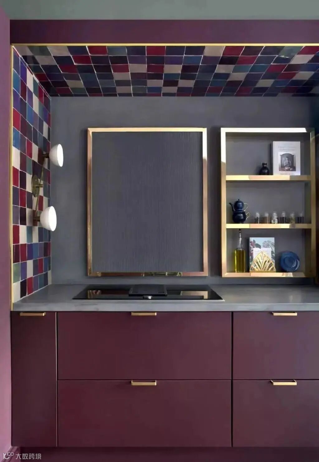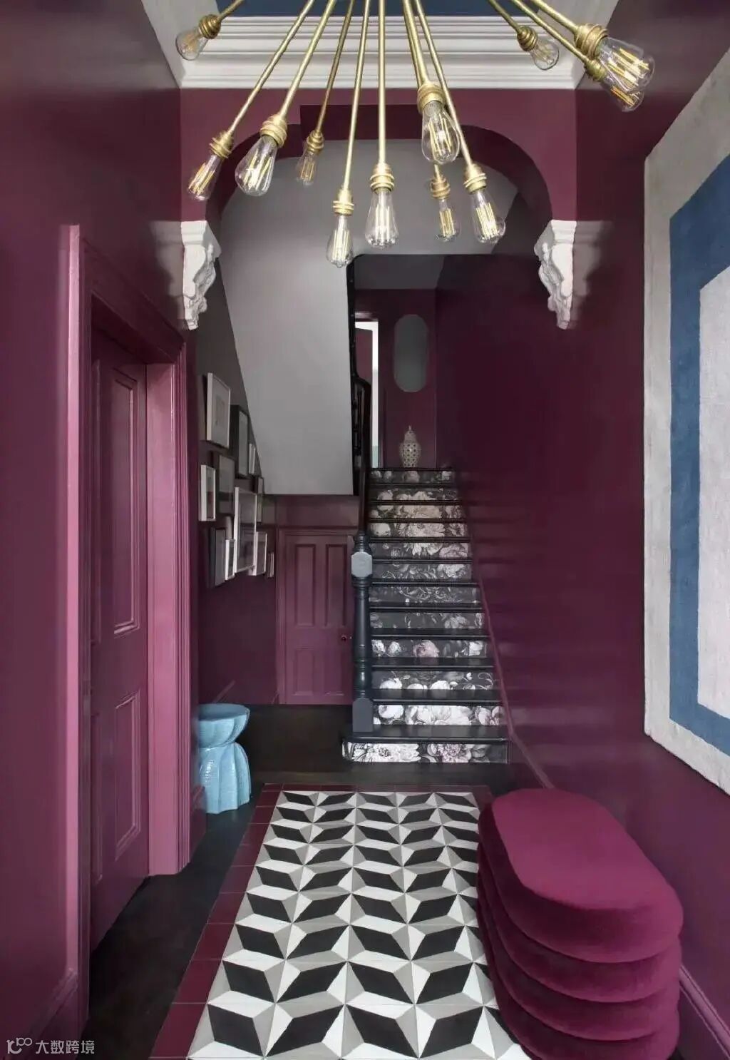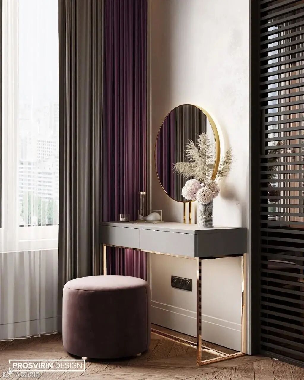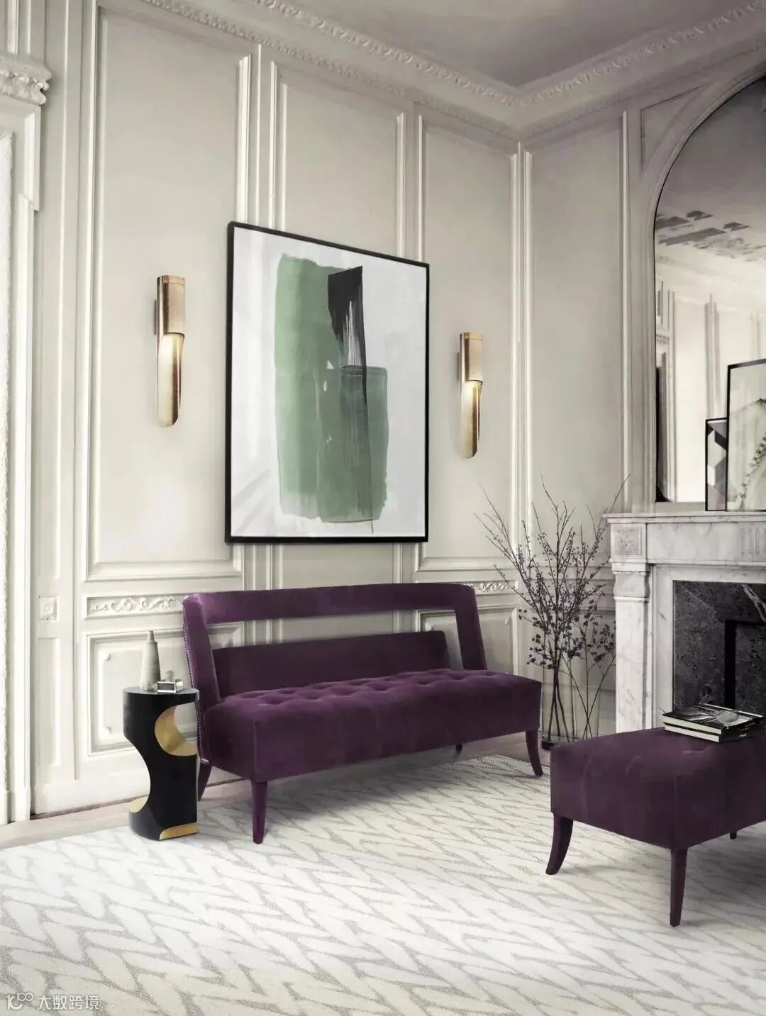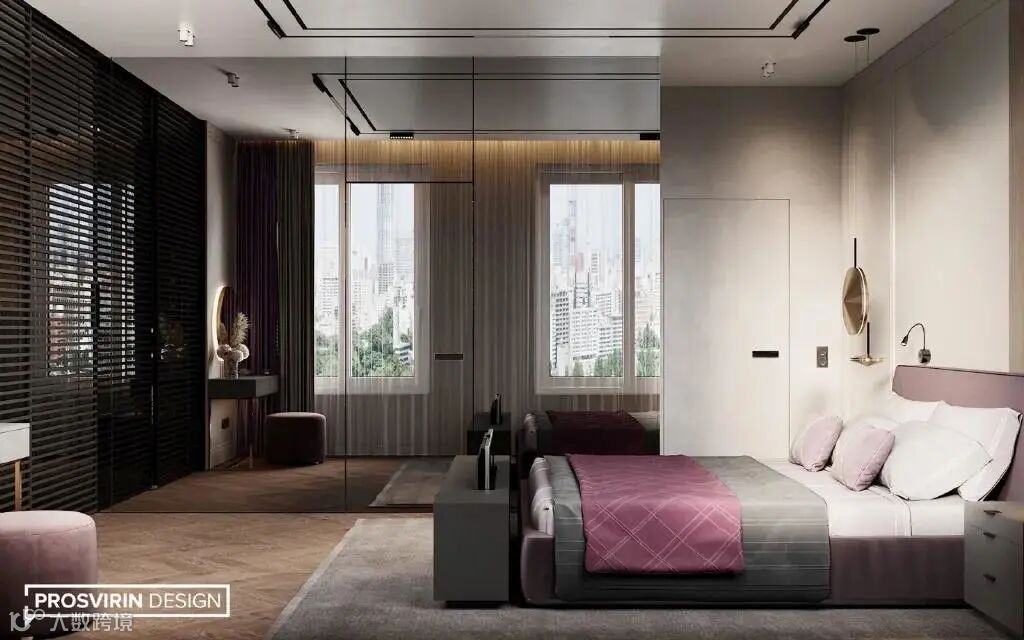 如果用丝绒材质的葡萄紫来搭配金属饰面或者是金属的材质,那么这个空间是非常的神秘、复古奢华,同时又非常的庄重高贵。