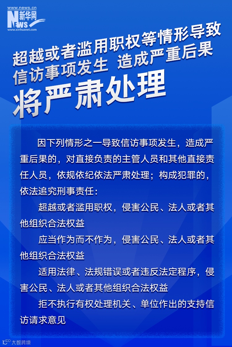 日前,中共中央、国务院印发的《信访工作条例》全文公布,条例共6章50条,自今年5月1日起施行。条例详尽规定了信访工作的各环节事项,以下亮点值得关注,一起来学习吧!