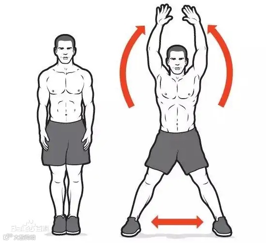 2. 用力向上跳起,同时双脚向两侧张开。手掌心在开始应该朝下,在跳跃向上的过程中慢慢转向掌心朝前