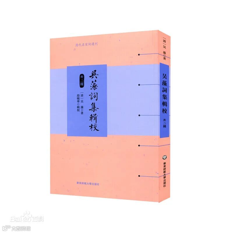 此书为浙江人民出版社一九年出版,其实内容与上面华东的差别不大,只是多了一些注释与插页影印,简体横排,偶有字误,但还不影响阅读。只是会让人觉得有些不舒服的感觉(至少我是)。另吴藻还有《吴藻词传》一部,亦是此书笺释者江民繁先生所作。吾老友沈尘色《清名家词传》有吴藻一章。《小檀栾馆闺秀词》有影印吴藻词集一册。