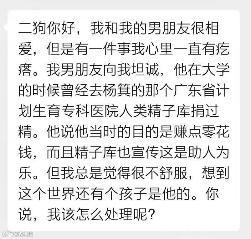 一位女生投稿说,她和男友很相爱,但男友向她坦诚,他大学时曾为赚零花钱去捐过精,这在女生心里留下了疙瘩,她想到这个世界上还有其它孩子是男友的就觉得很不舒服。