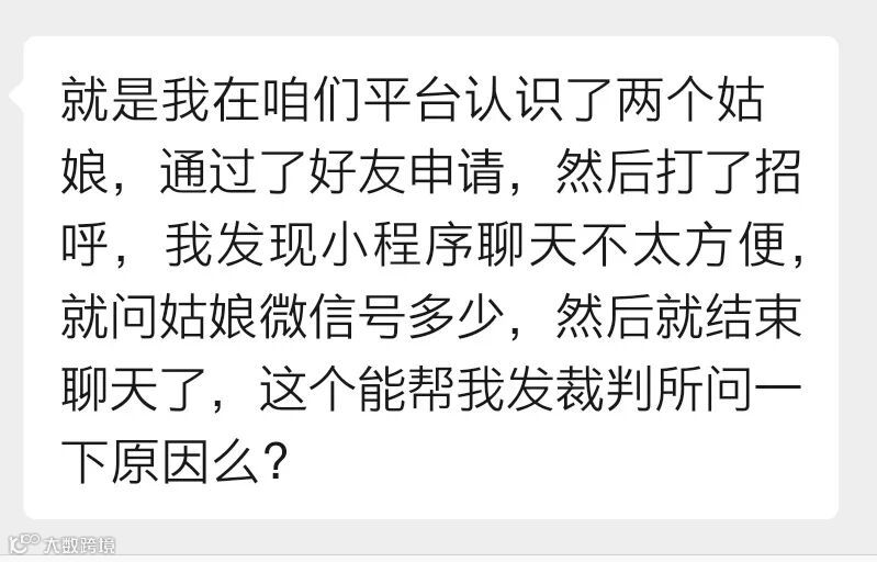 一位男生投稿说,他在平台给两位女生发了“想认识”申请,对方都通过了。但他觉得小程序聊天不太方便,打了招呼后,就问女生微信号多少,希望在微信聊,结果她们都点了“结束聊天”。