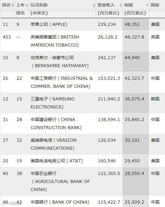 第二,500强最赚钱公司排名前十的公司为:苹果、英美烟草、伯克希尔·哈撒韦、中国工商银行、三星电子、中国建设银行、威瑞森电信、美国电话电报公司、中国农业银行、中国银行。工农中建全部入围前十。