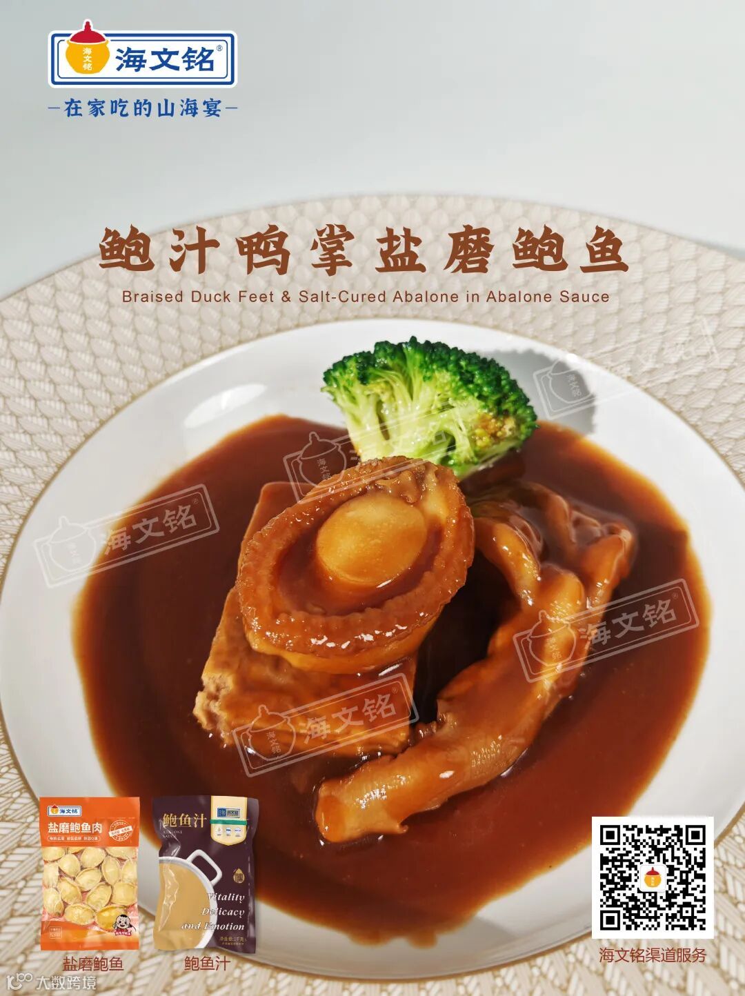 海文铭盐磨鲍鱼肉、鲍鱼汁、鸭掌、西兰花