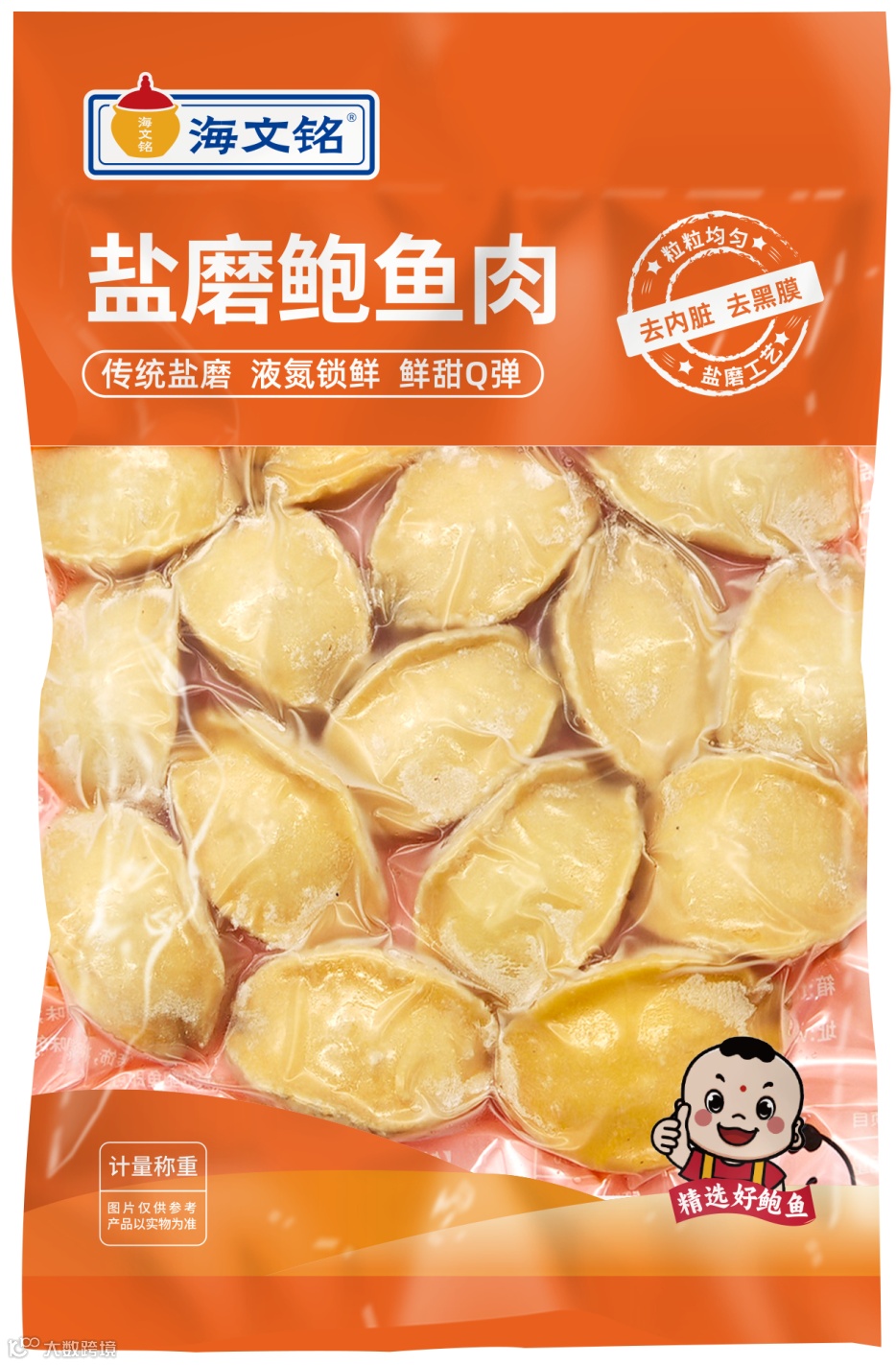 产品特点:来自福建海域的鲍鱼经过盐磨工艺后,外表金黄形似元宝,口感Q弹鲜甜,搭配鲍鱼汁烹饪Q弹浓郁。