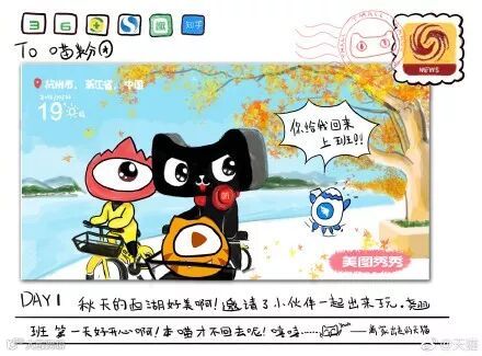其实具体猫去干啥,猫也有一张具体的说明,请看这张明信片:在360的保护下,带着一帮小伙伴儿,跟新浪微博一起去浪了!