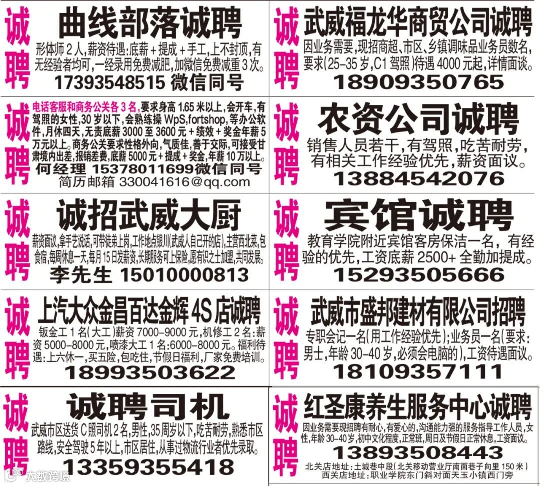 武威红柳广告和武威视觉传媒有限公司倾力打造武威本地网上生活平台,给您更好的本地资讯。招聘、求职、出租、转让、二手交易等便民信息查找、发布,商家优惠,吃喝玩乐购全都有。