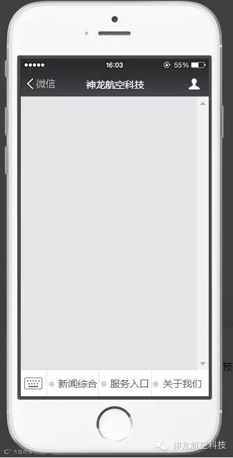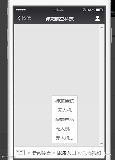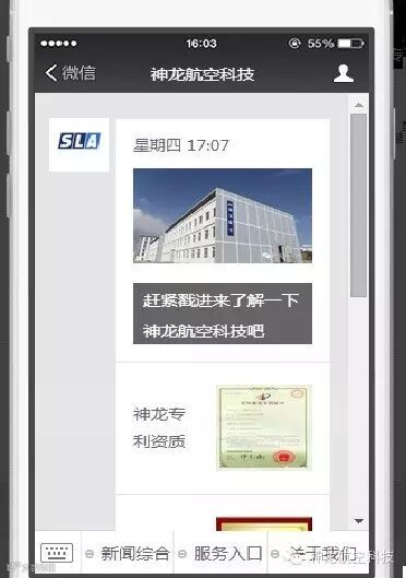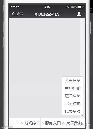 首先,神龙航空科技公众微信平台分为了三个板块,分别是新闻综合、服务入口和关于我们。
