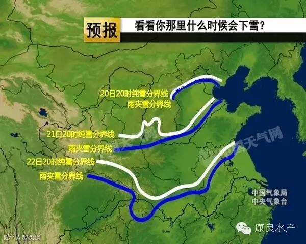 从时间上看,昨天开始,雨雪分界线逐渐南压,昨天夜间在北京南部到河北中部一带,今天晚上推进到华北南部、陕西关中一带;明天晚上,雨雪分界线继续南进,抵达苏皖北部、湖北中部一线。