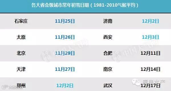 省会级大城市中,北京、天津、石家庄、太原、西安、郑州、济南、武汉、合肥、南京,都有可能在接下来的几天当中陆续迎来今冬初雪。从气候平均数据来看,像华北黄淮一带的常年初雪都在11月底-12月初,而在江淮、江汉,常年初雪都在12月中旬了。今年华北的初雪稍微偏早,而长江中下游的初雪则是明显偏早,提前了半个月以上。不过这并不是初雪最早的一年(有气象纪录以来南京武汉最早初雪11月9日,合肥为11月7日)。