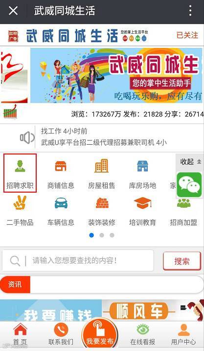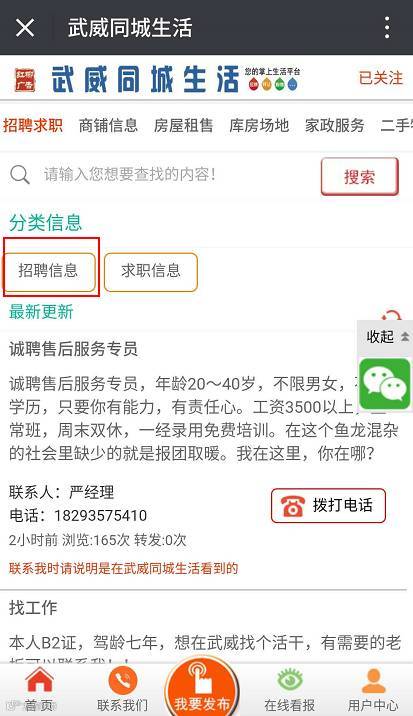 还可以在点击本公众号菜单栏中【同城信息】→【查找信息】→进入【武威同城生活】网→点击分类【招聘】版块→查找招聘信息。如图所示▼