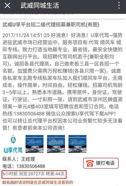 第四类:在我们公众号或者报纸登广告的顾客,如果想要达到广告置顶的效果;这边给您解释一下,我们武威同城生活后台中的信息,不能绝对的置顶,您可以通过分享朋友圈让更多的朋友分享点击广告,这样点击率就上去了。(看得人也就多了)
