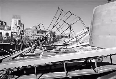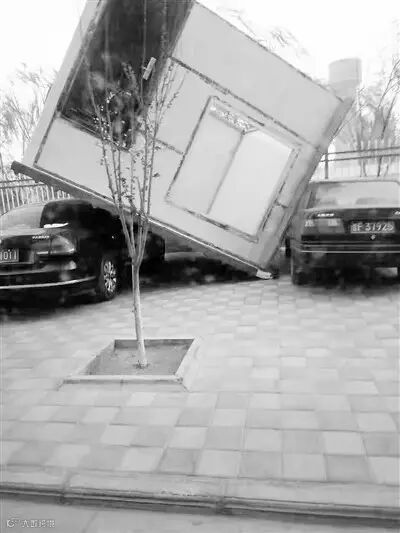 大风刮翻的简易房压在车顶上。