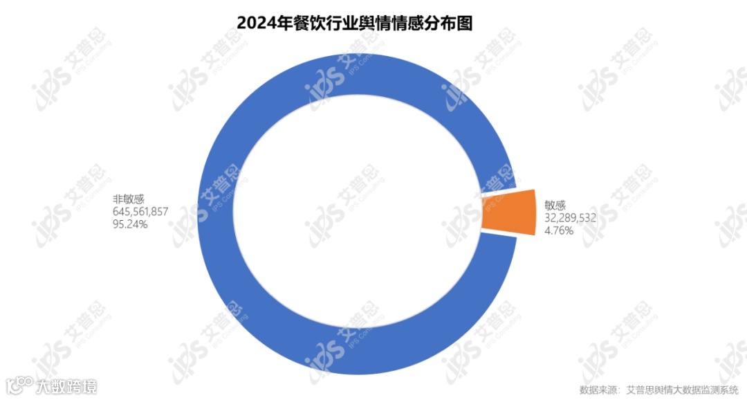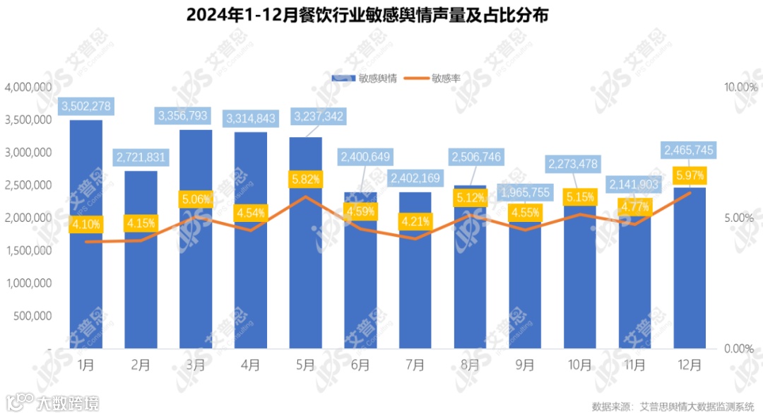 2024年,系统监测到与餐饮行业高度相关的敏感舆情声量32,289,532篇次,敏感率6.11%,涉及话题“麦当劳退款原因写‘顾客是傻x’续:已与顾客达成谅解”、“鲁迅‘代言’奶茶?家属已发律师函,乐乐茶道歉!”、“被曝使用转基因大豆油!天津多家肯德基门店被立案调查”、“一女子在海底捞店内拍不雅视频,警方通报”、“知名奶茶品牌被上海消保委点名!曾10天热销百万杯……你喝过吗?”等。
