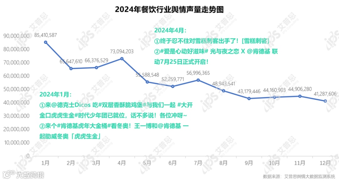 从声量走势来看,2024年餐饮行业舆情声量最高峰峰为1月份,主要由话题““肯德基宅急送 x 龙年宅吉星@时代少年团 7位成员高清海报重磅释出!”“举杯益禾堂祥龙十八涨”带动声量;