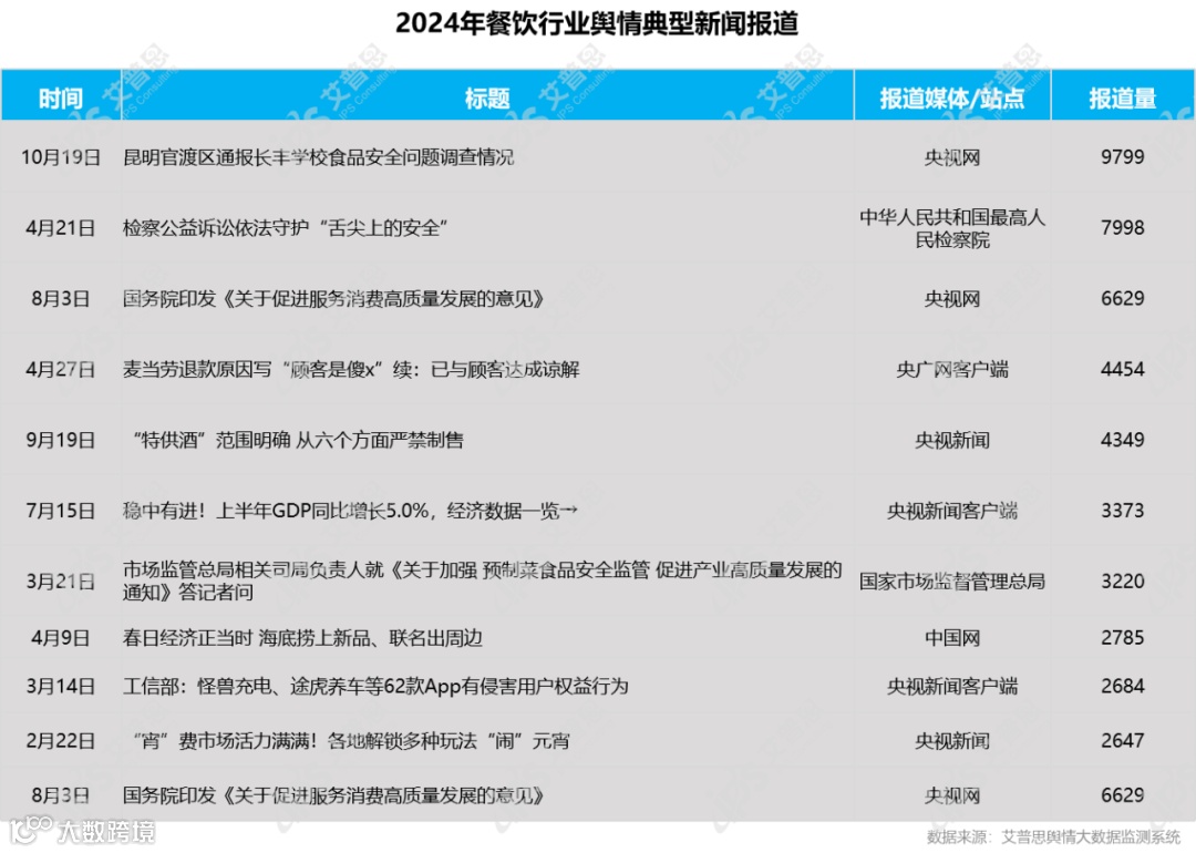 2024年,餐饮行业舆情典型报道有《昆明官渡区通报长丰学校食品安全问题调查情况》、《检察公益诉讼依法守护“舌尖上的安全”》、《国务院印发《关于促进服务消费高质量发展的意见》》等,报道量排名前十的信息为: