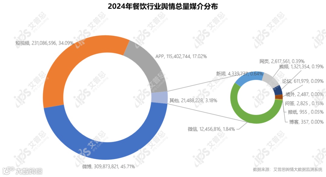 2024年,餐饮行业舆情声量来源中,占比最高的媒介为微博,达45.71%,舆情声量为309,873,821篇次;其次为短视频,舆情声量达231,086,596篇次,占比34.09%;排名第三的是APP,舆情声量达115,402,744篇次,占比17.02%。