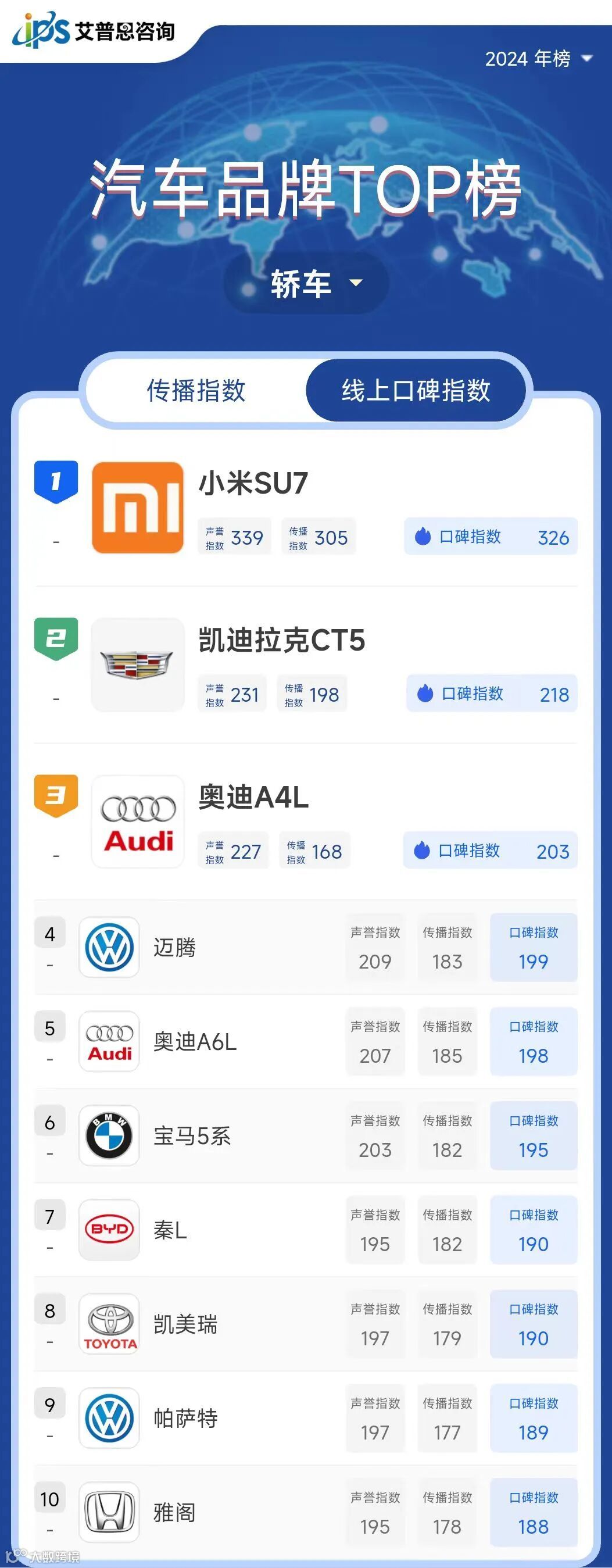 2024年线上口碑指数排名前三的汽车车型为:小米SU7(口碑指数326)、仰望U8(口碑指数219)、凯迪拉克CT5(口碑指数218)。