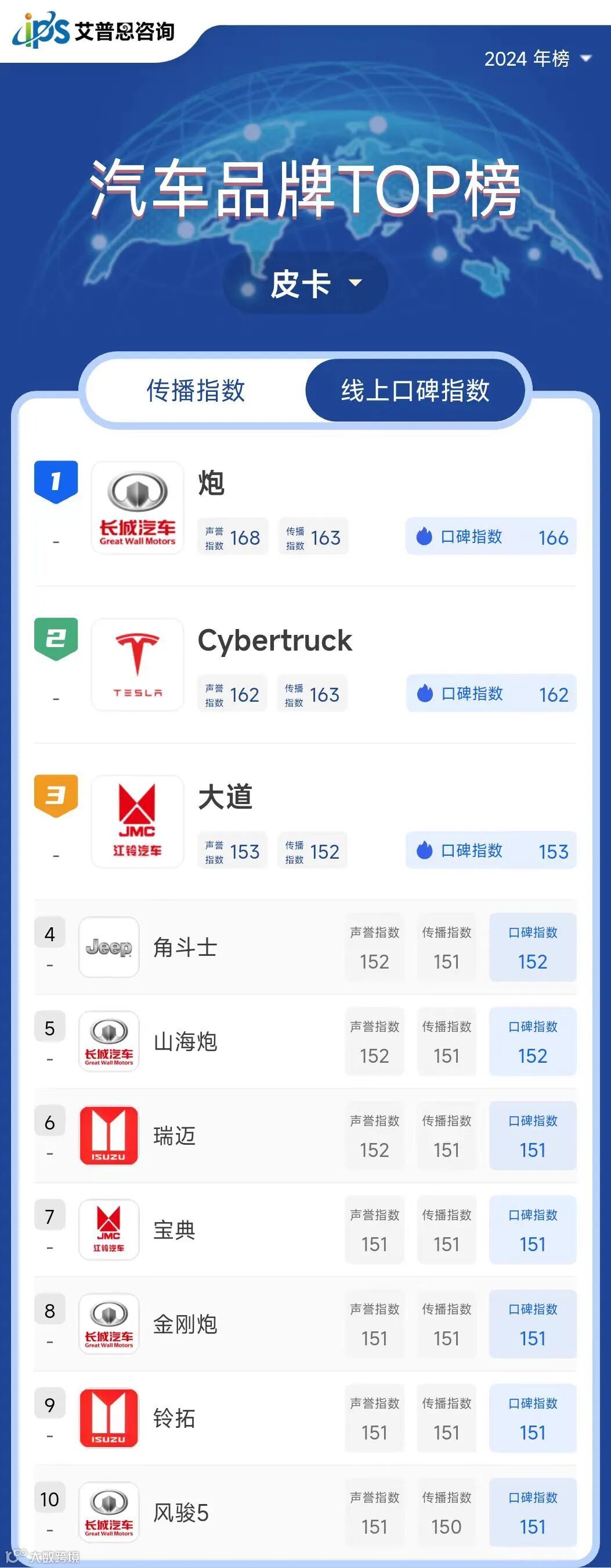 线上口碑指数排名前三的跑车车型为:保时捷911、仰望U9、保时捷718;线上口碑指数排名前三的皮卡车型为:炮、Cybertruck、大道。