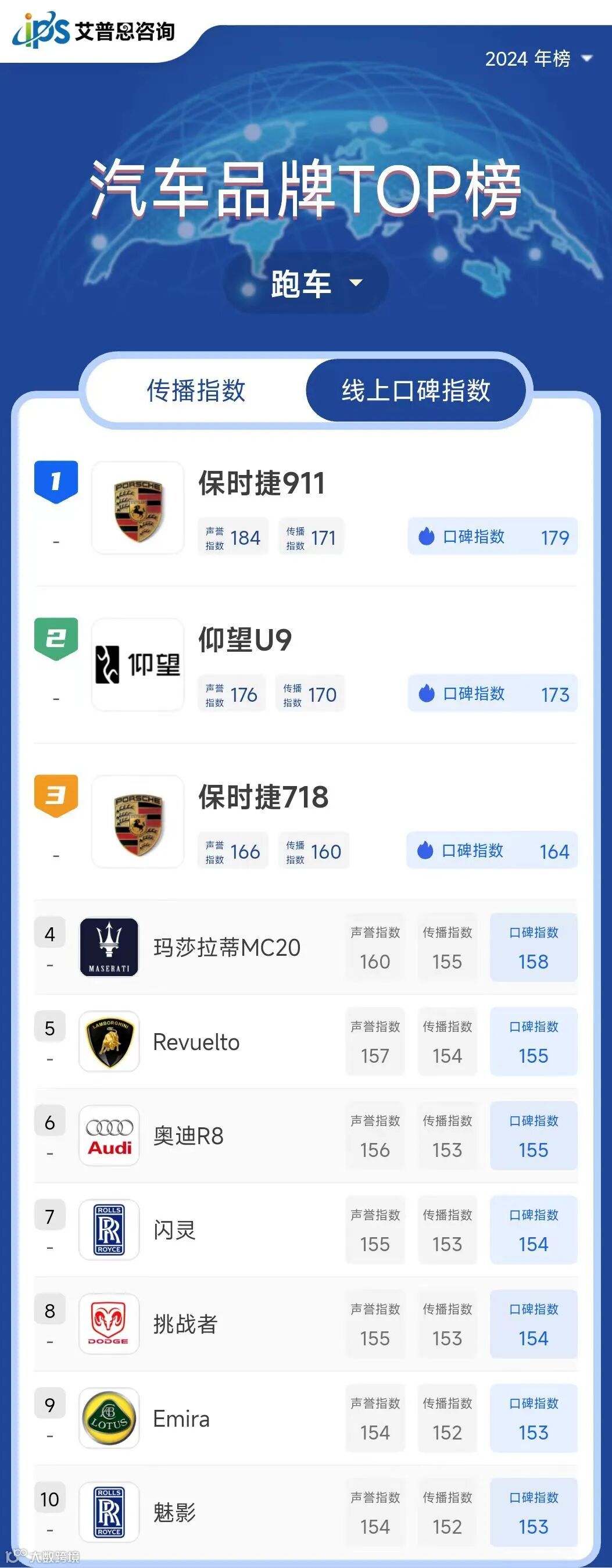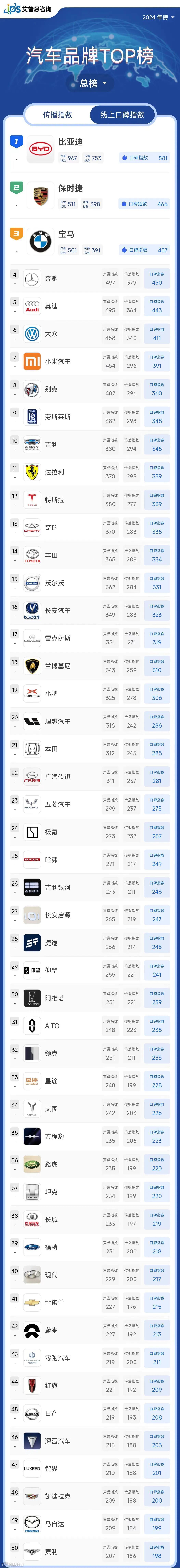 2024年线上口碑指数排名前三的汽车品牌为:比亚迪(口碑指数881)、保时捷(口碑指数466)、宝马(口碑指数457)。