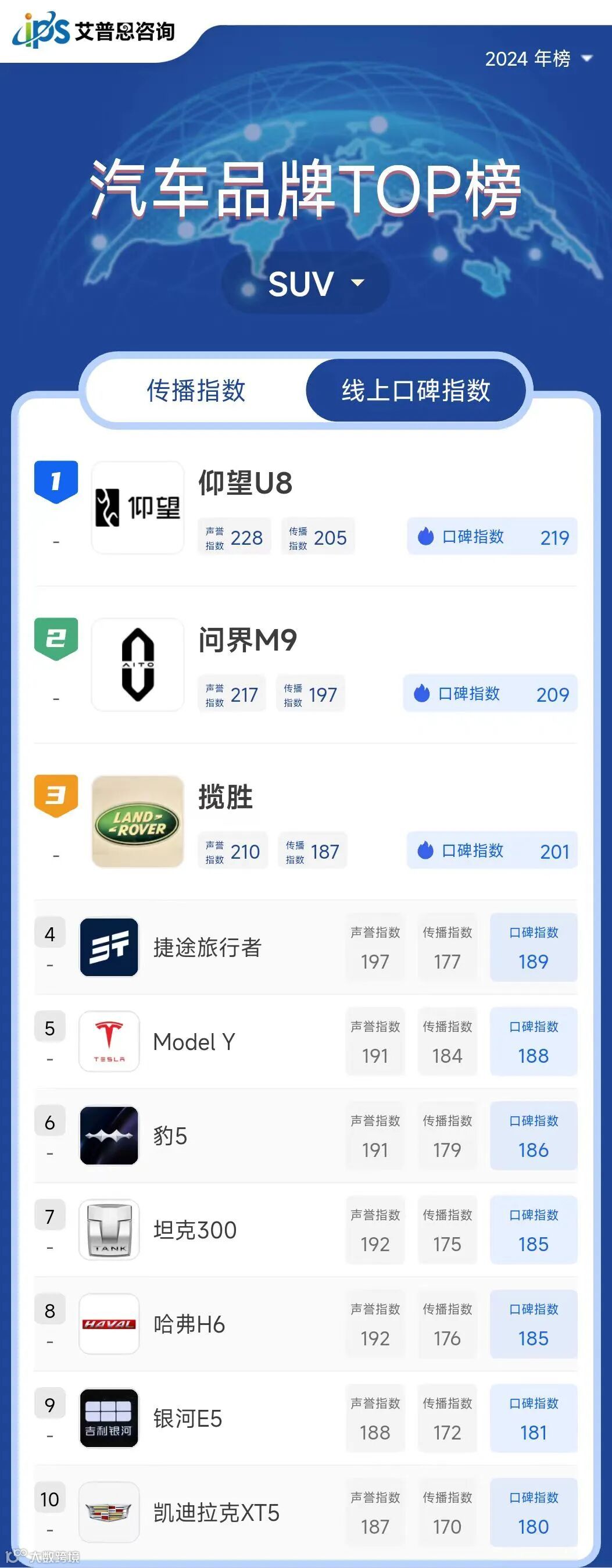 线上口碑指数排名前三的轿车车型为:小米SU7、凯迪拉克CT5、奥迪A4L ;线上口碑指数排名前三的SUV车型为:仰望U8、问界M9、揽胜;线上口碑指数排名前三的MPV车型为:别克GL8、小鹏X9、奥德赛。