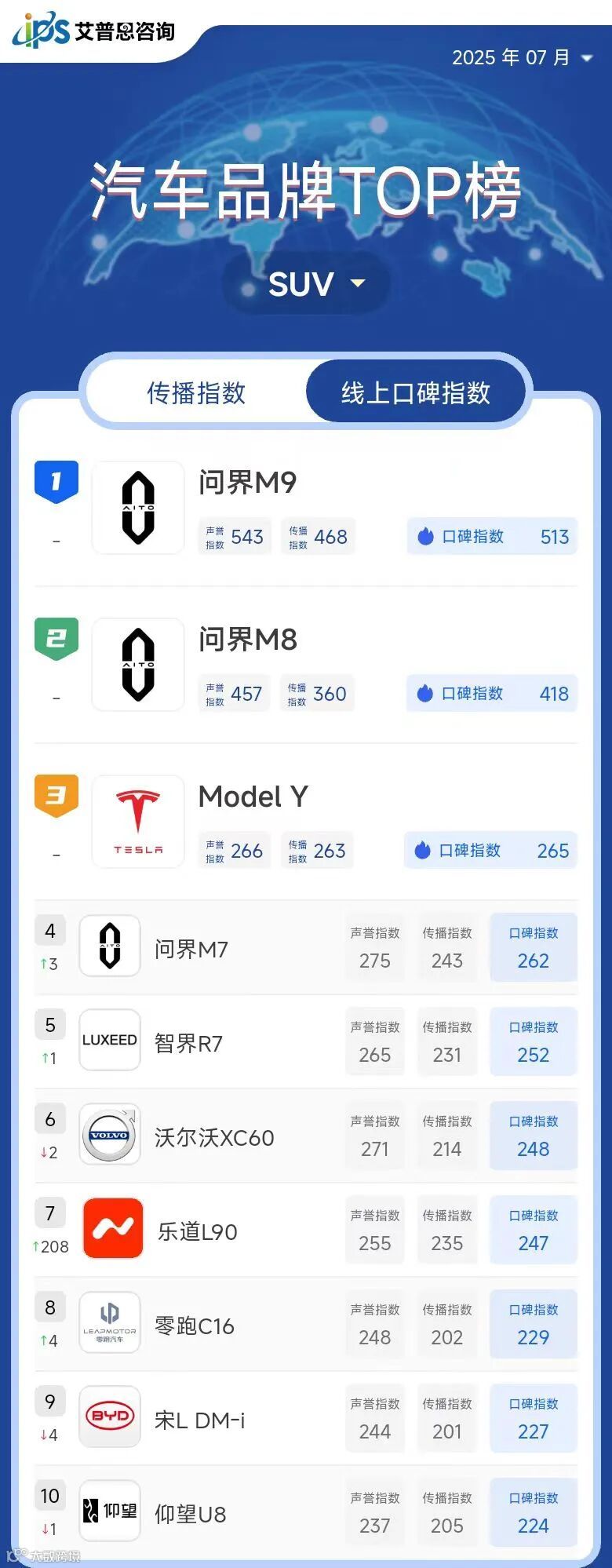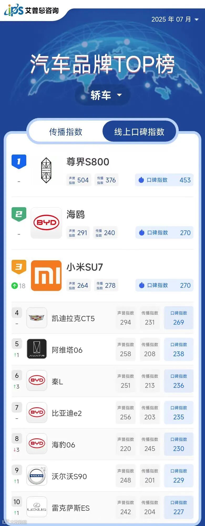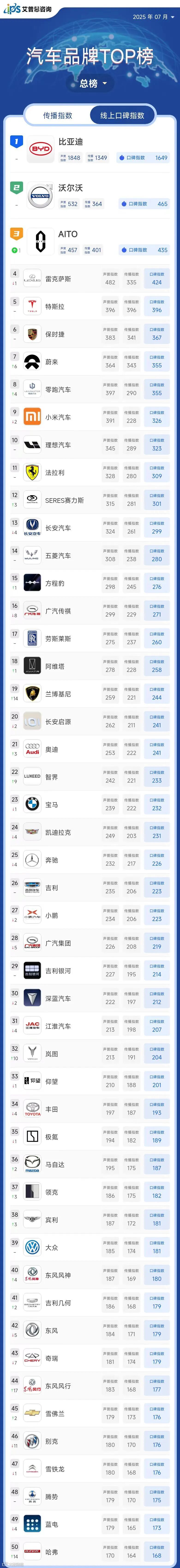 艾普思指数|2025年06月中国汽车品牌线上口碑指数TOP50