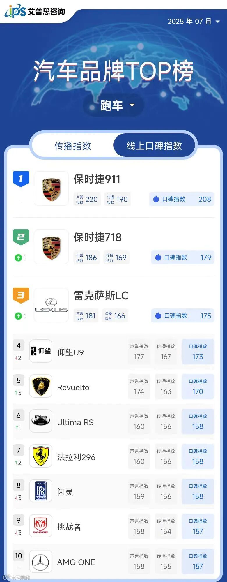 跑车线上口碑指数TOP10
