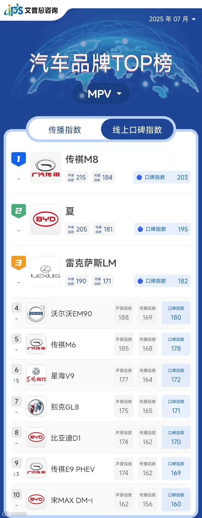 MPV线上口碑指数TOP10