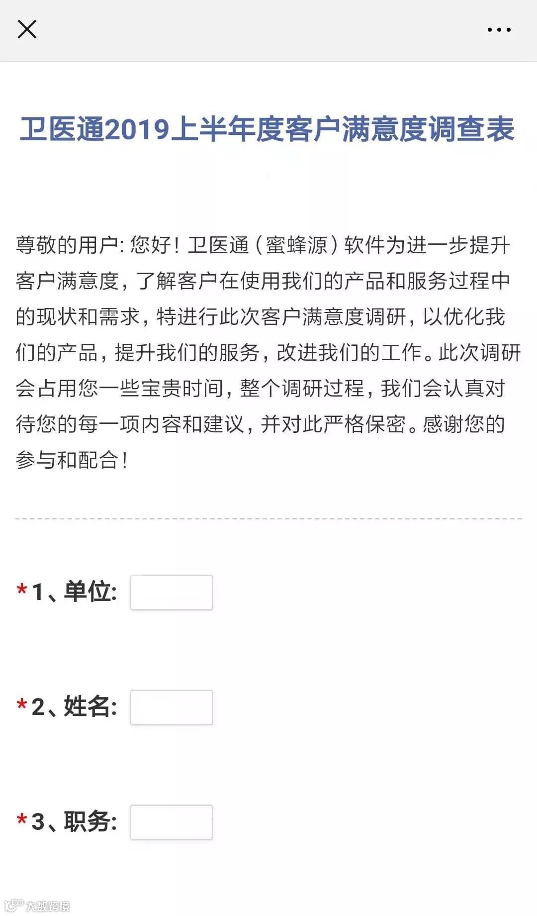 为了进一步提升用户体验和满意度,深入了解用户需求,卫医通日前推出“2019上半年度卫医通客户满意度调查”。调查就功能改进建议、售后服务评价、新制度施行满意度、精装账薄服务等方面进行了问卷摸底,以便卫医通改进、提升工作。在调查过程中,所有问卷回复信息将严格保密,期待您的参与和回复。
