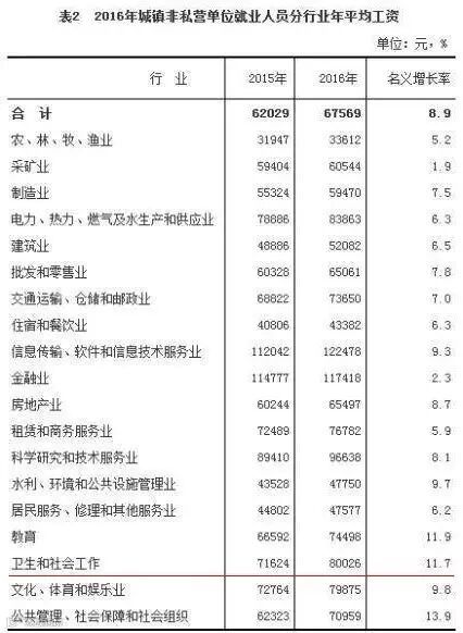 国家统计局日前公布了2016年分行业平均工资数据,全国城镇非私营单位就业人员年平均工资为67569元。统计数据显示,2016年卫生和社会工作年平均工资80026元,较2015年增长11.7%,收入水平在非私营19个行业中排第5位。