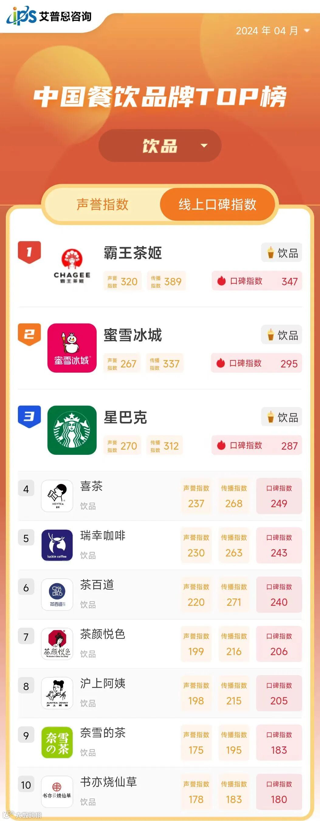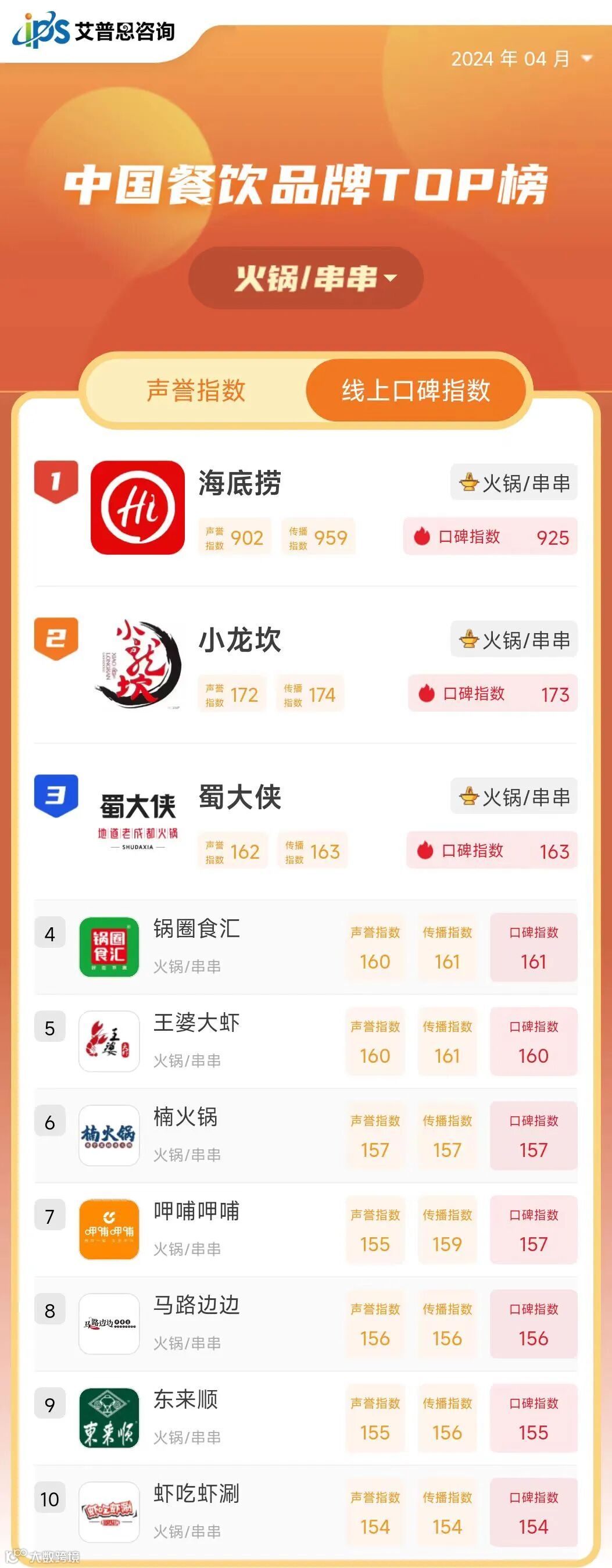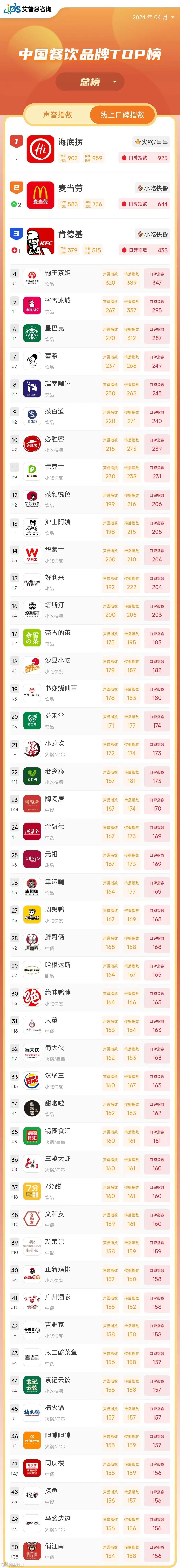 从子指数的表现来看,4月传播指数、声誉指数最高的餐饮品牌均为海底捞(传播指数959,声誉指数902)。