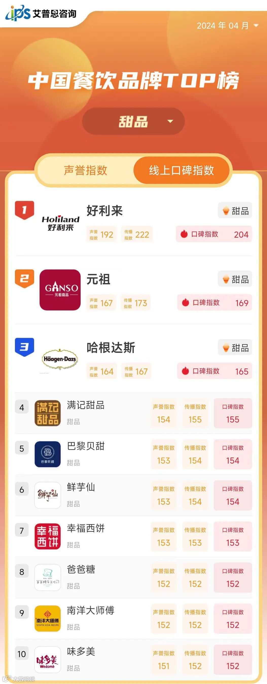 线上口碑指数排名前三的甜品品牌为:好利来、元祖、哈根达斯;线上口碑指数排名前三的饮品品牌为:霸王茶姬、蜜雪冰城、星巴克*;线上口碑指数排名前三的日韩料理品牌为汉拿山、N多寿司、鲜目录寿司*;线上口碑指数排名前三的西餐品牌为豪客来、gaga、王品牛排。