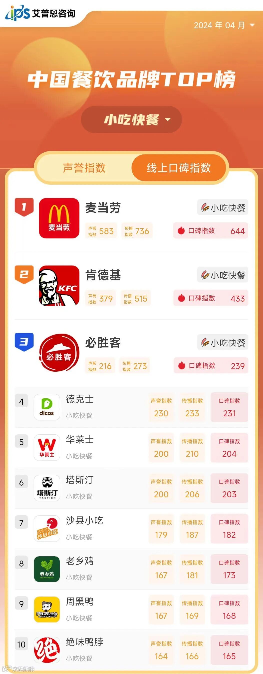 4月线上口碑指数排名前三的餐饮品牌为:海底捞(火锅/串串,口碑指数925,排名与上月持平)、麦当劳(小吃/快餐,口碑指数644,排名较上月上升2位)、肯德基(小吃/快餐,口碑指数433,排名较上月下降1位)。