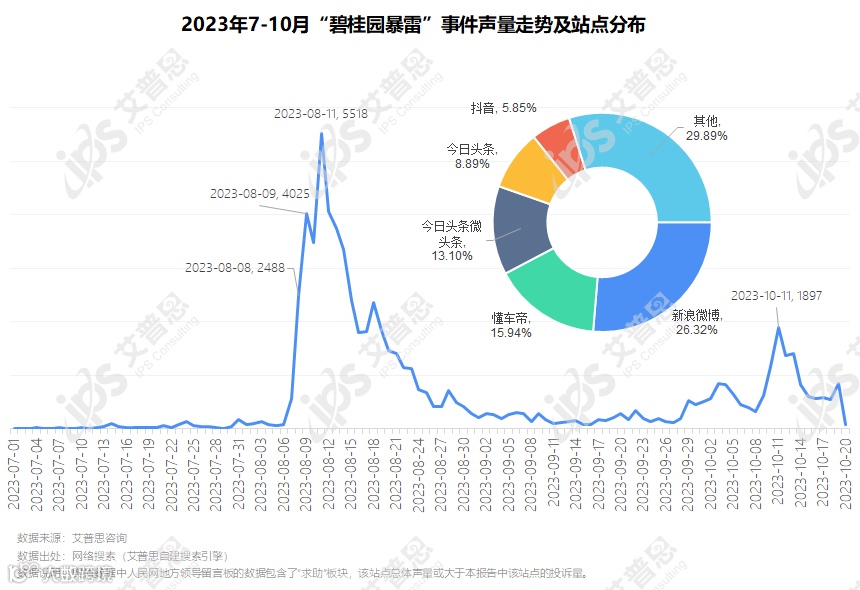 图2:2023年7-10月“碧桂园暴雷”事件声量走势及站点分布