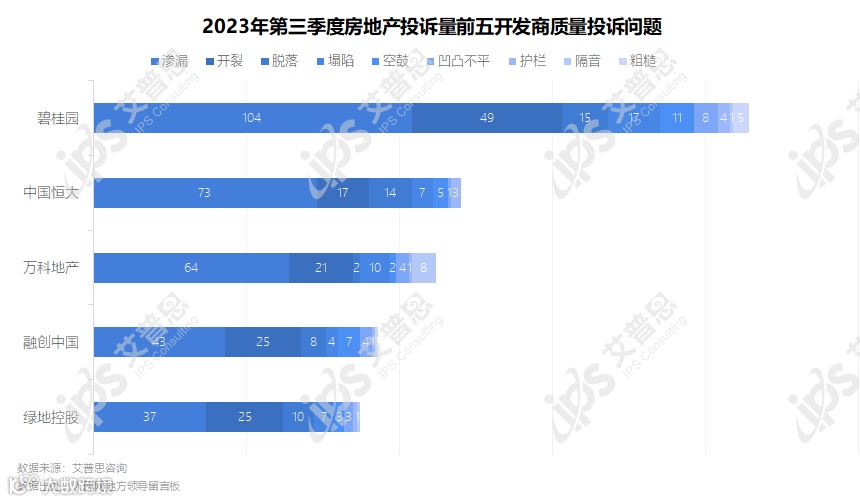 2023年第三季度,投诉量前五开发商质量投诉具体问题中,渗漏、开裂仍为主要问题,碧桂园收到渗漏相关投诉104起、开裂相关投诉49起;中国恒大、万科地产分别收到渗漏相关投诉73起、64起;融创中国、绿地控股均收到开裂相关投诉25起。