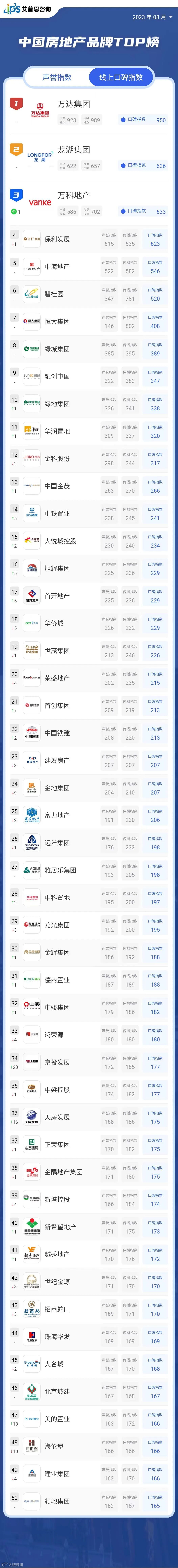 艾普思指数 | 2023年07月中国房地产品牌线上口碑指数TOP50