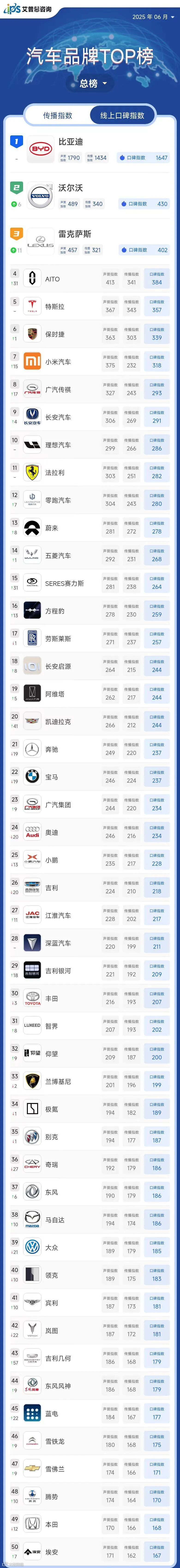 2025年6月线上口碑指数排名前三的汽车品牌为:比亚迪(口碑指数1647,排名与上月持平)、沃尔沃(口碑指数430,排名较上月上升6位)、雷克萨斯(口碑指数402,排名较上月上升11位);
