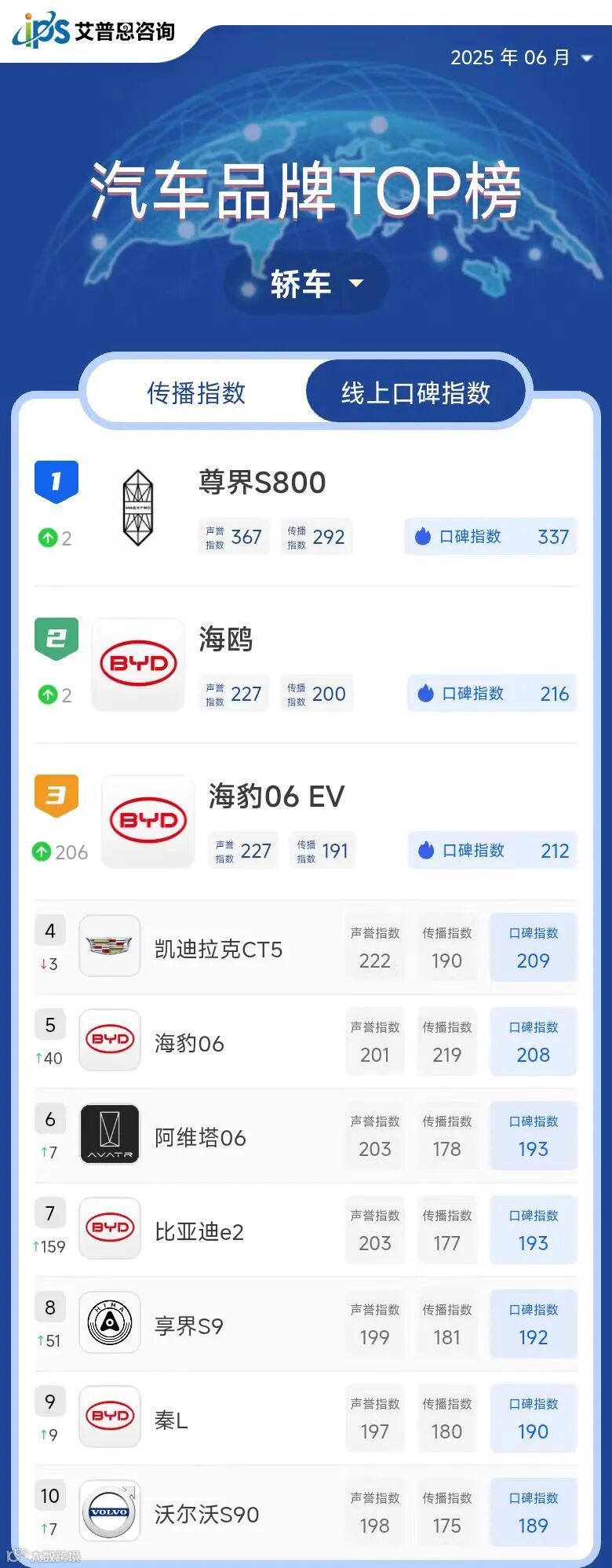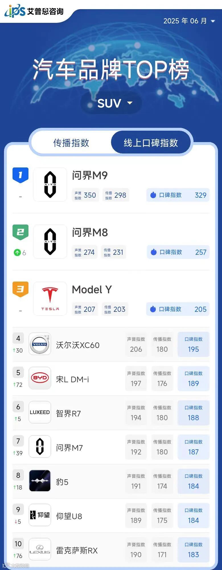 艾普思指数|2025年05月中国汽车品牌线上口碑指数TOP50