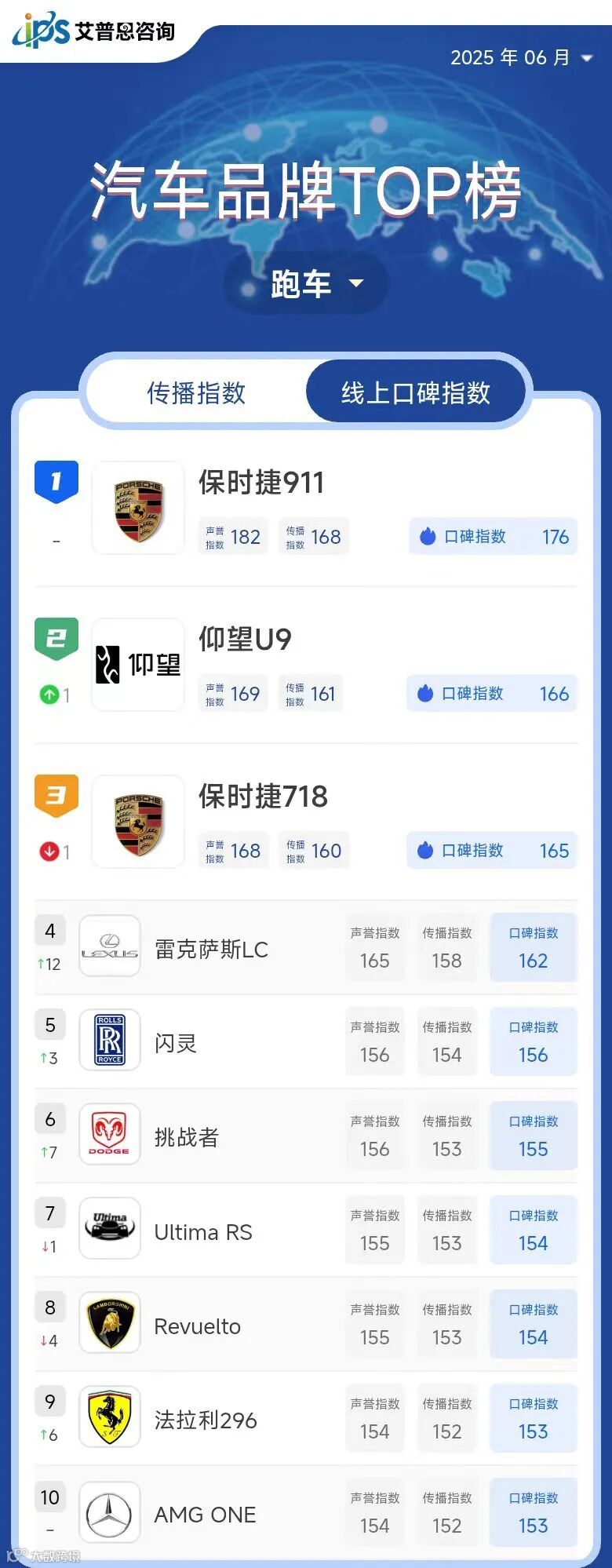 跑车线上口碑指数TOP10