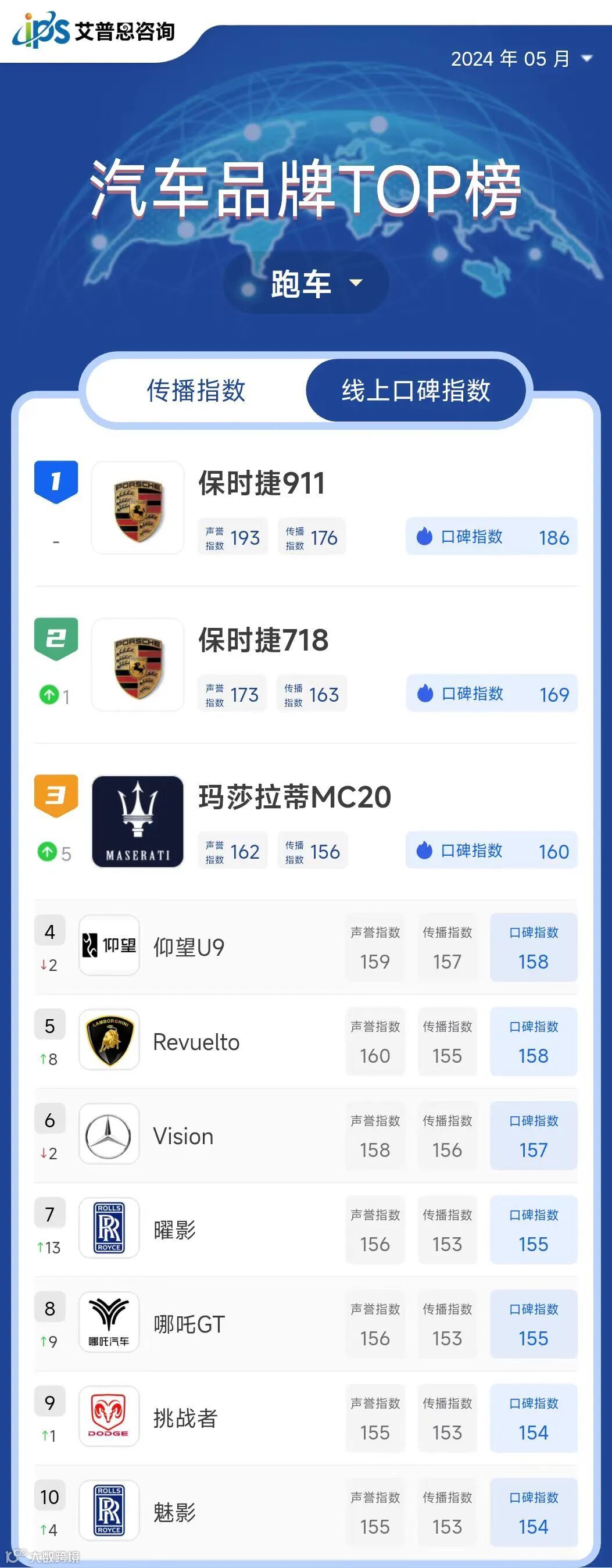 跑车线上口碑指数TOP10