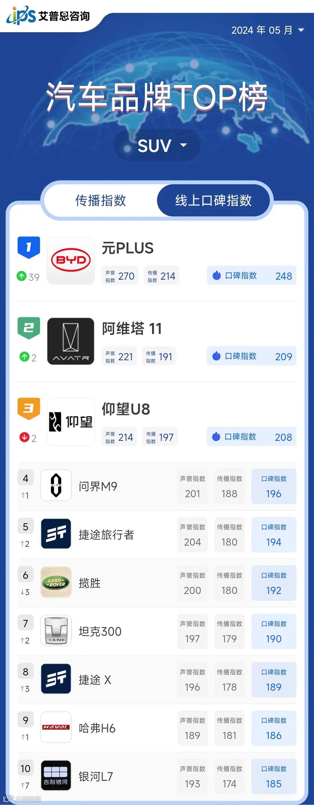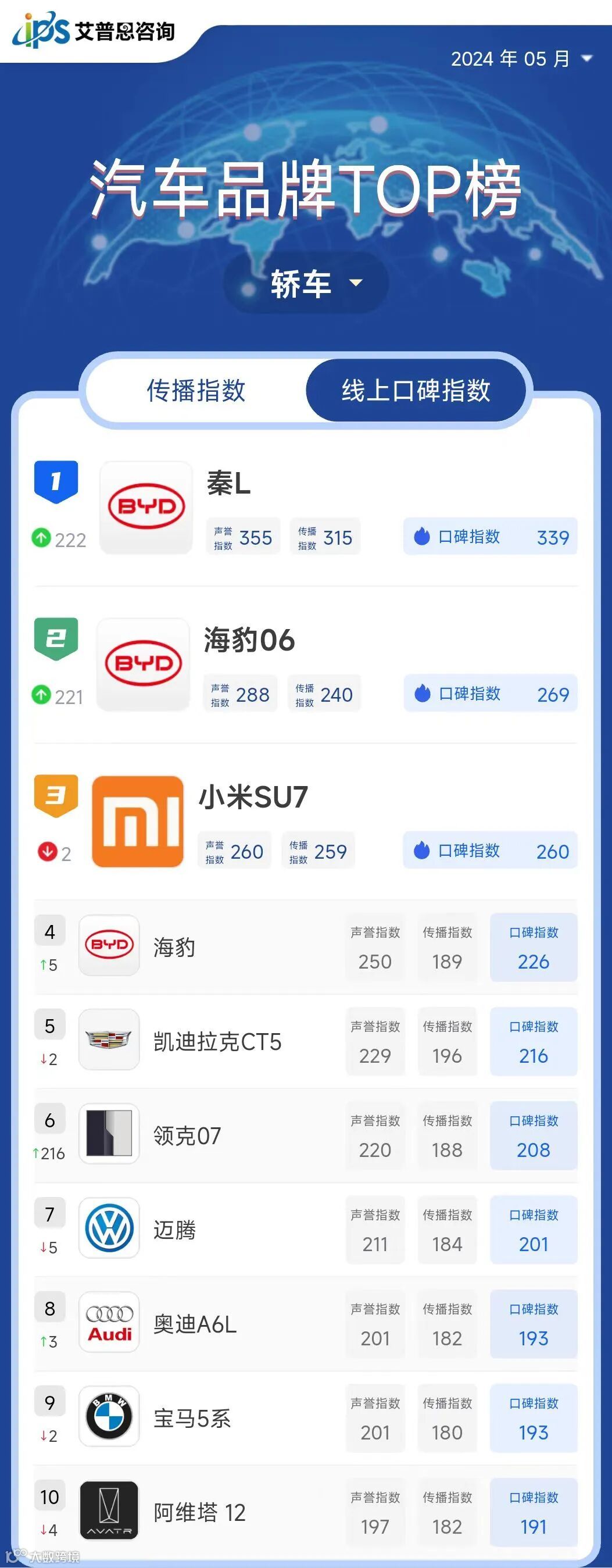 艾普思指数|2024年04月中国汽车品牌线上口碑指数TOP50