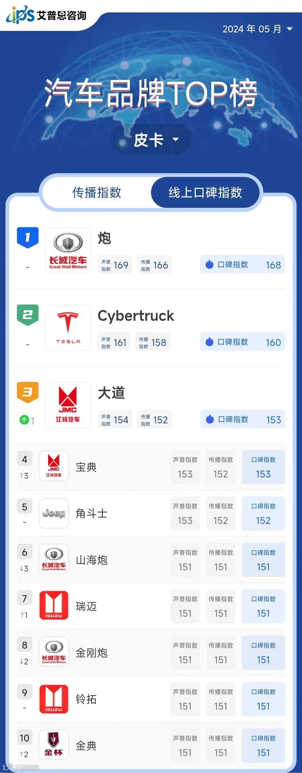 皮卡线上口碑指数TOP10